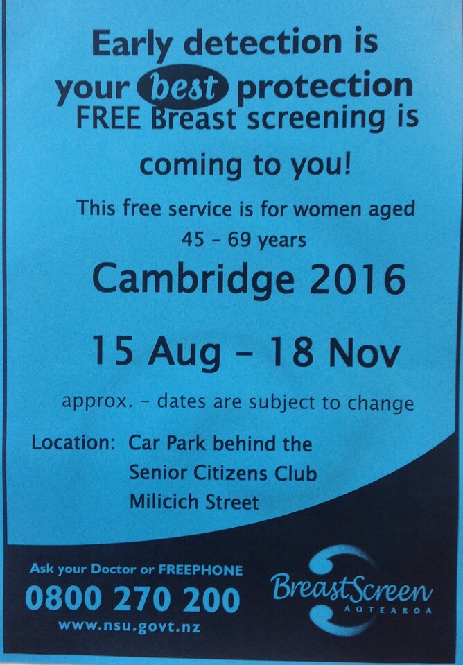 Spring is here, finally and with it comes the Breast Screening bus. The bus will be located in the car park behind the Senior Citizens Club on Milicich Street. This is a completely free service for ladies aged 45-69 years. The bus has been in Cambridge from 15 August and it will remain here until 18 November, so there is plenty of time to have your routine breast screen.
