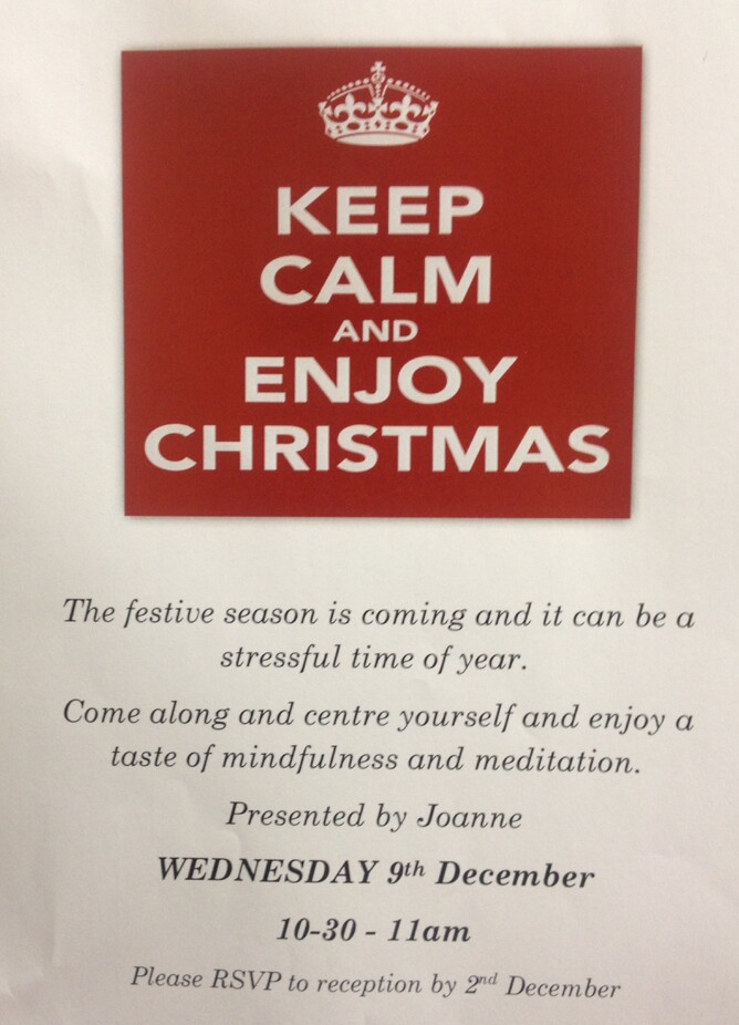 Christmas is a lovely, but also, often a stressful time of the year. Come and learn how you can make the festive season less stressful and set yourself up for a happier, healthier 2016. Book your place at Joanne's free taster session on Mindfulness and meditation at Cambridge Family Health on Wednesday 9th December at 10.30am. We can all be happier and healthier by learning to be more Mindful-let Joanne show you how!