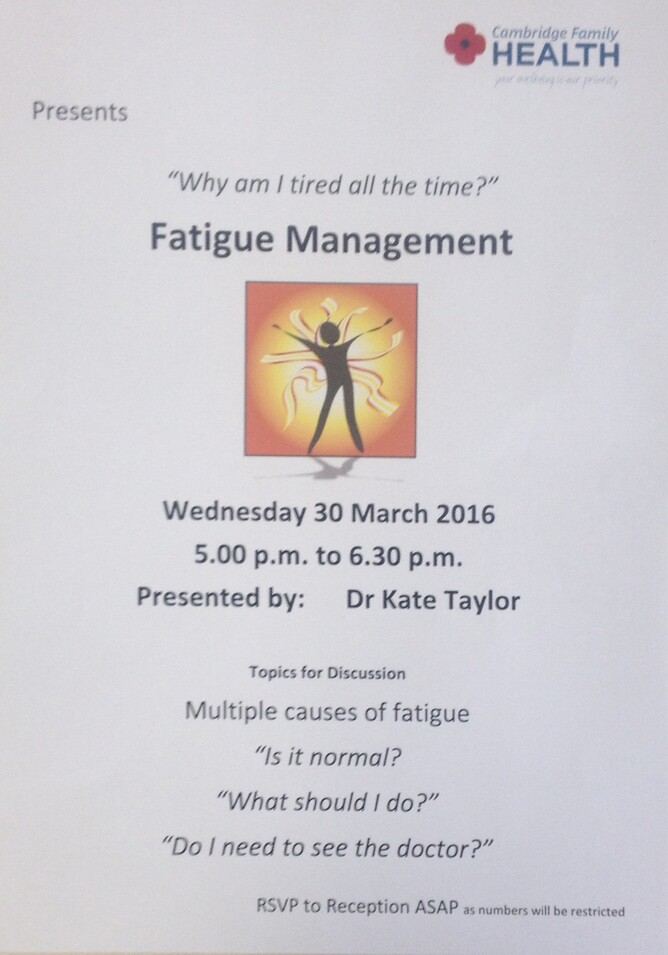 We are excited to be kicking off our 2016 health talks with a session on Fatigue Management. Dr Kate Taylor has a great deal of experience and a special interest in the management of fatigue, so if you, or someone you know, is tired all the time please call us on 8274234 to book your place at this talk. It will also be a great opportunity for people to meet Kate and find out a little bit more about what she does and the services she offers.